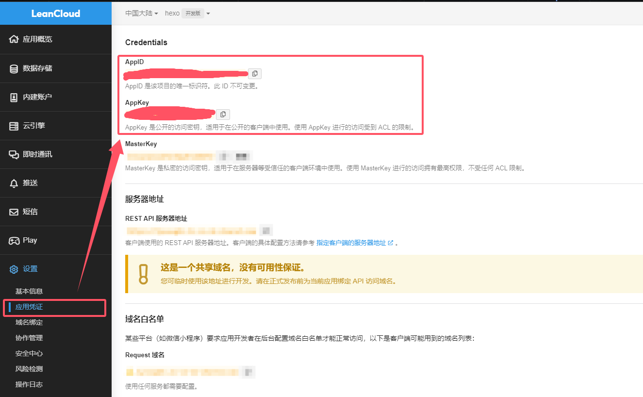 ④设置-应用凭证,找到AppID和AppKey,复制好;