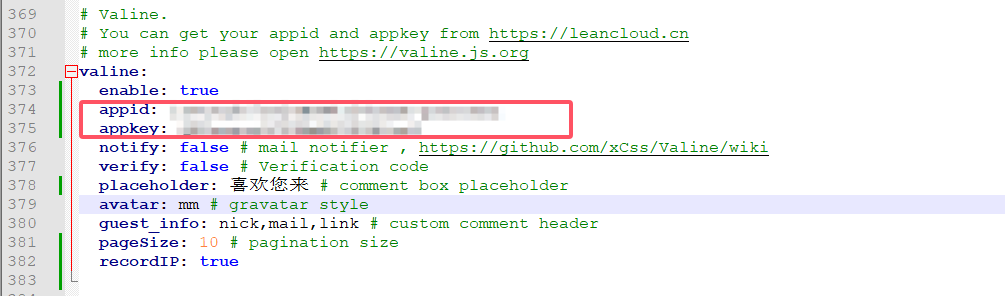 ⑤回到config.yml,找到Valine的配置处,填写刚刚复制的AppID和AppKey,其他的按照图里这么填就行,无所谓;