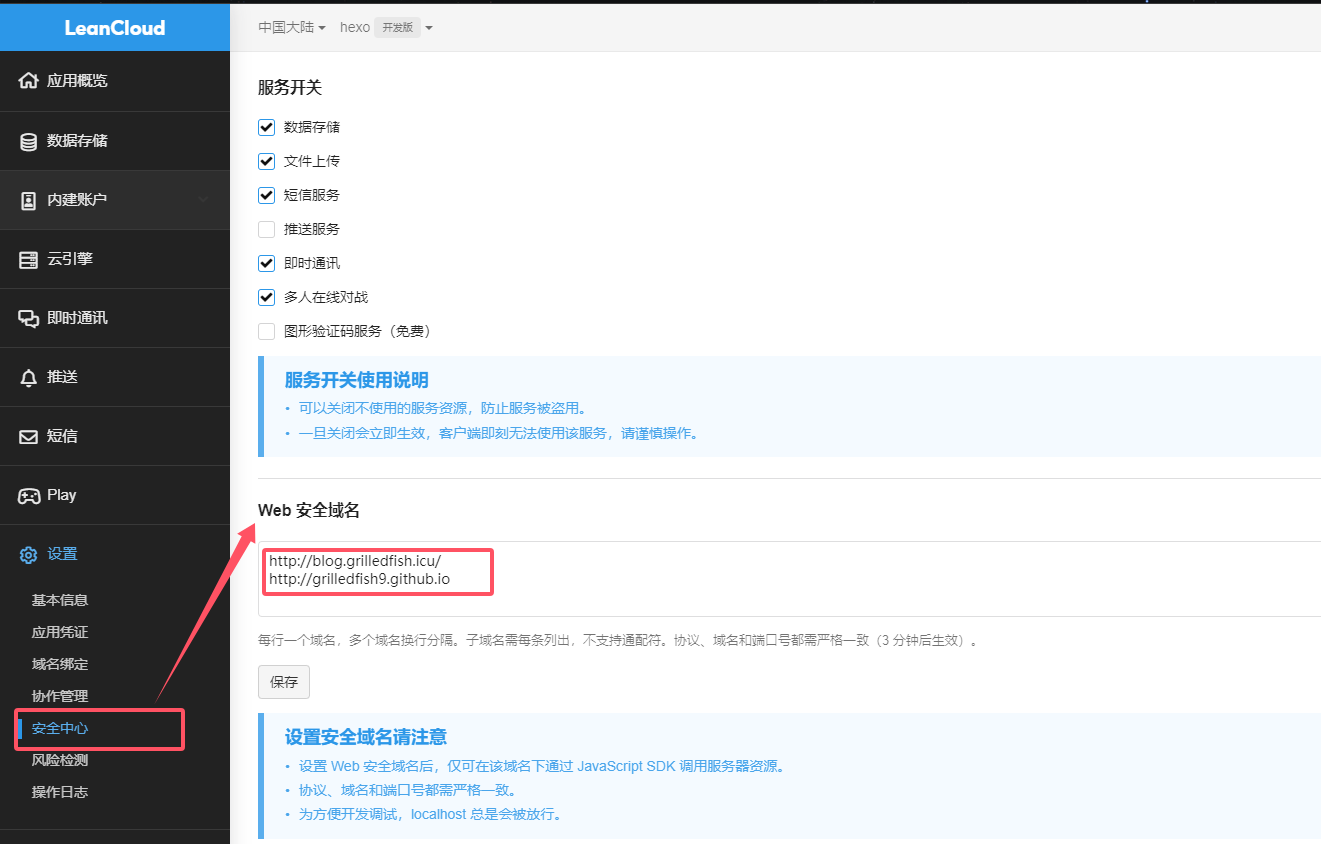 ⑥设置-安全中心-Web安全域名,填你的blog域名,我为了不踩坑CNAME和没有CNAME的都填上了;
