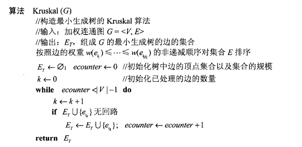 首先,将每个顶点放入其自身的数据集合中。然后,按照权值的升序来选择边。当选择每条边时,判断定义边的顶点是否在不同的数据集中。如果是,将此边插入最小生成树的集合中,同时,将集合中包含每个顶点的联合体取出,如果不是,就移动到下一条边。重复这个过程直到所有的边都探查过。